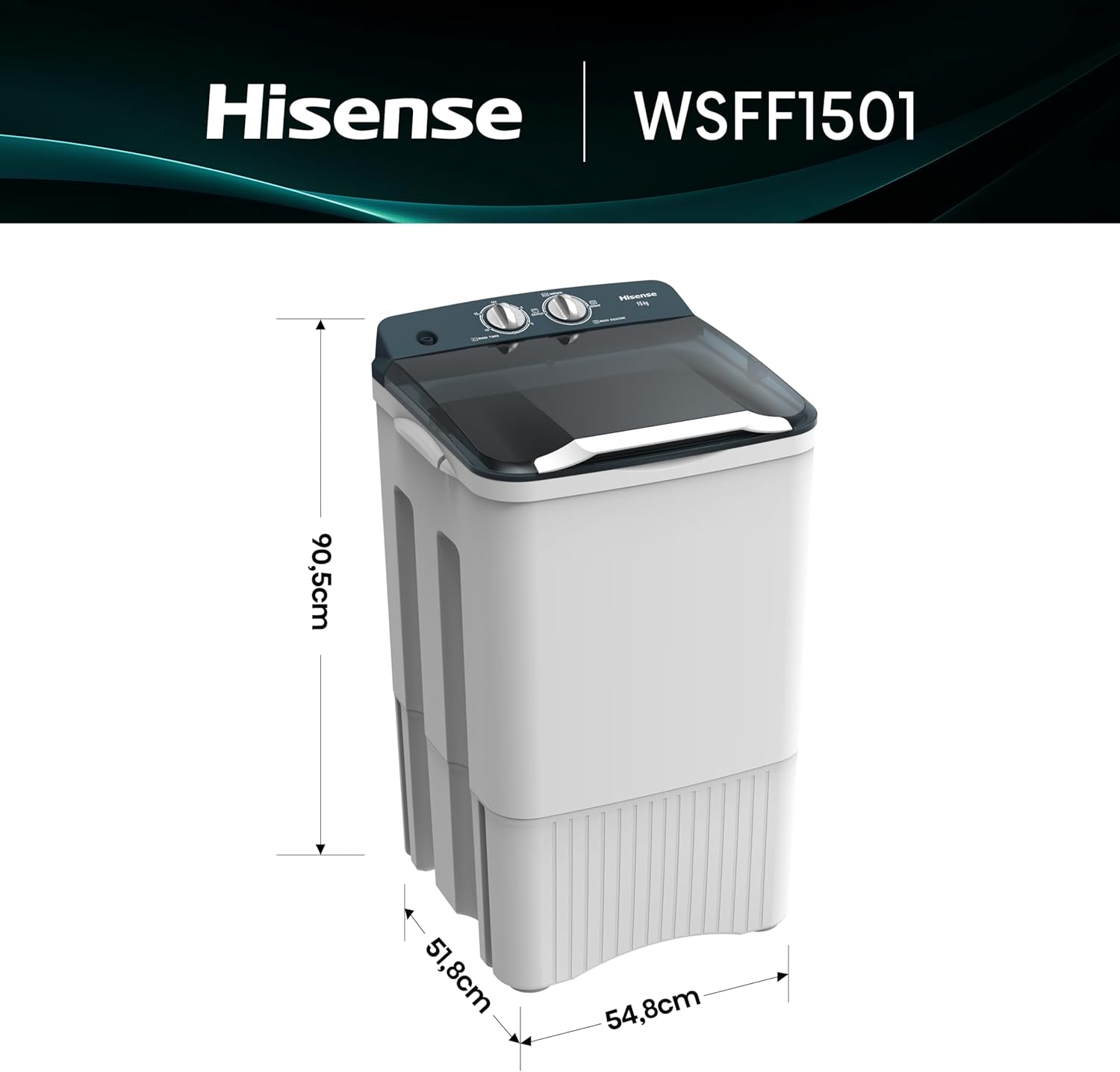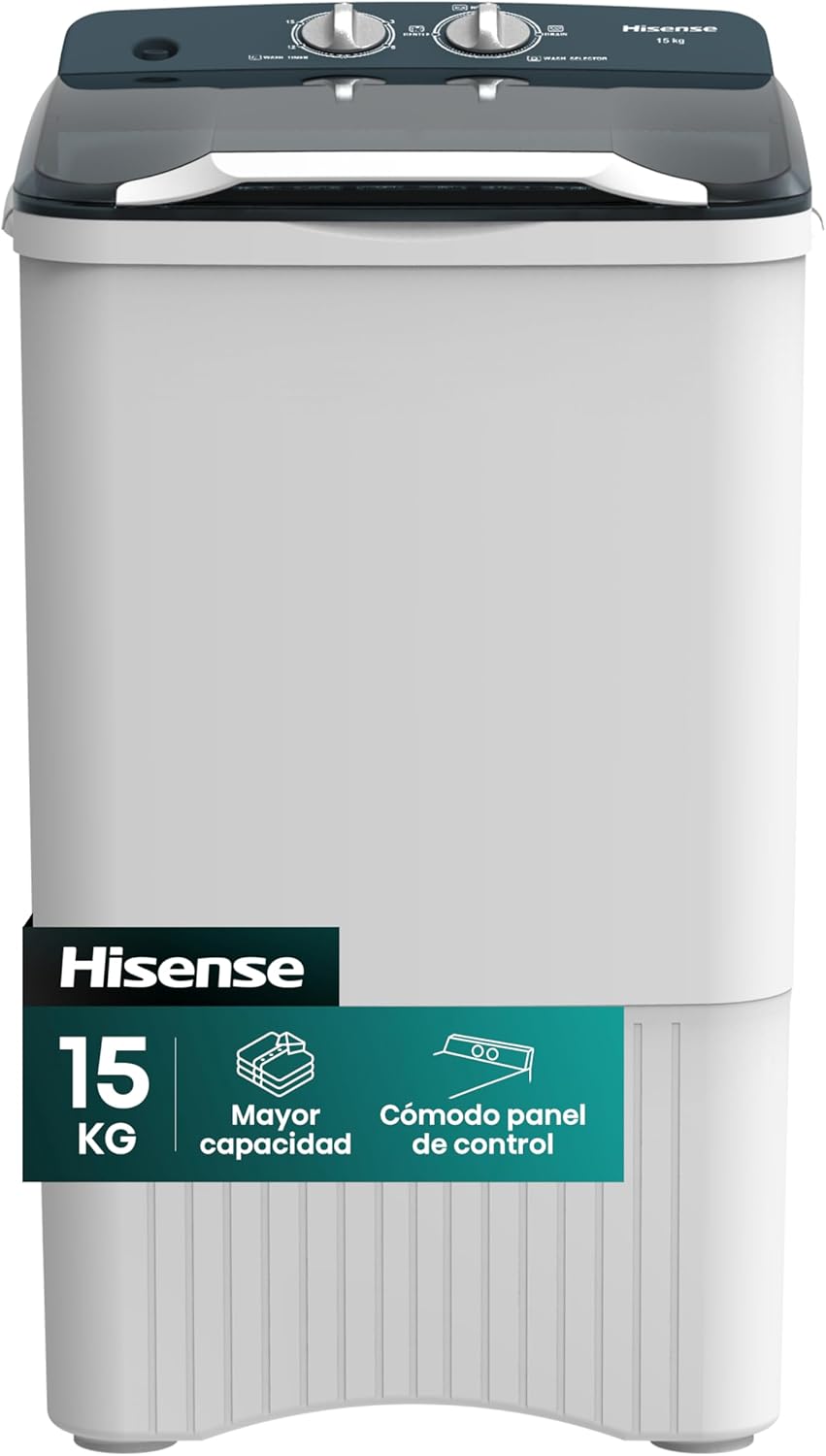 Hisense Lavadora WSFF1501, Semiautomática, 15 Kg, Temporizador de Lavado y Centrifugado, 55x52x91cm(AnchoxLargoxAlto), Blanco/Gris