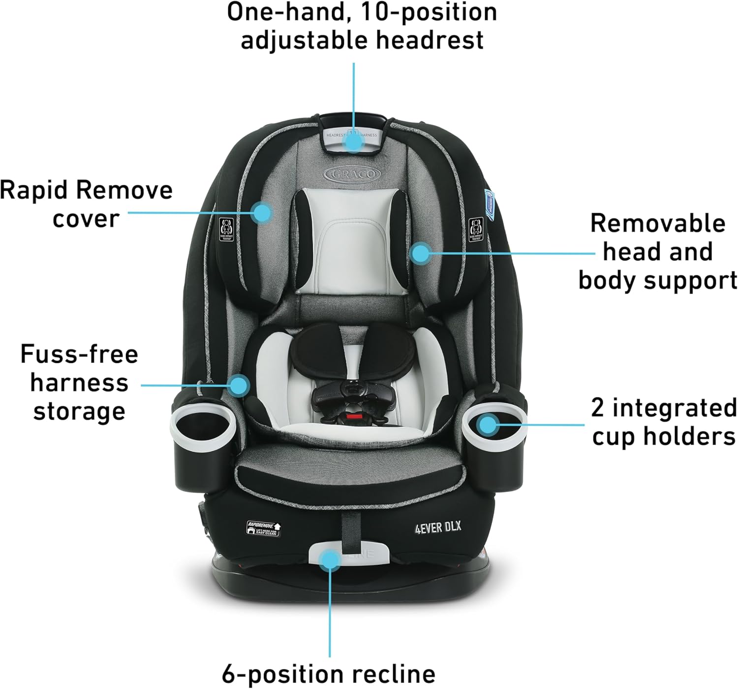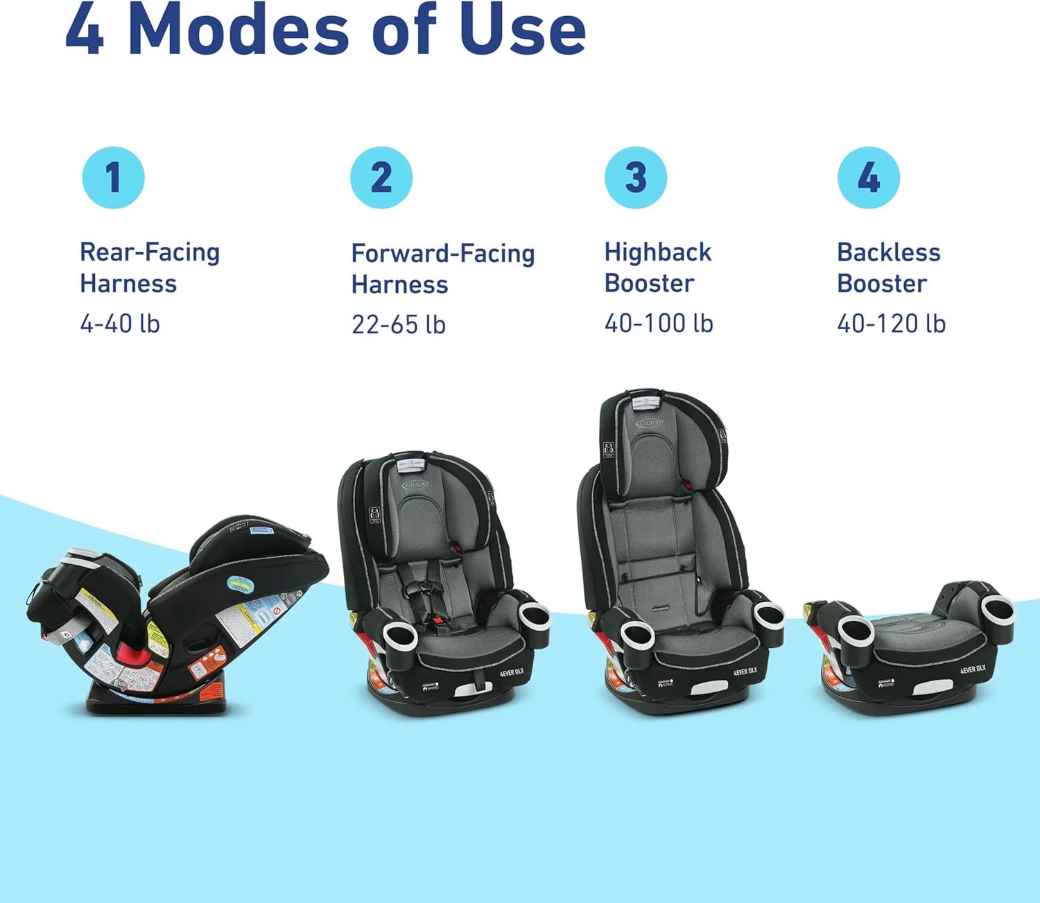 1 asiento de automóvil, 10 años de uso Nuestro asiento de automóvil 4Ever 4 en 1 ofrece 10 años de uso en un asiento de automóvil. Es el único asiento 4 en 1 que va de asiento de bebé a asiento elevador, de 2 a 54 kg (4 a 120 lb). Ahora actualizado con nuevas características, Graco 4Ever DLX 4 en 1 hace que cada viaje sea aún más cómodo, conveniente y seguro. ¡Es el único asiento de automóvil de seguridad que necesitará!*