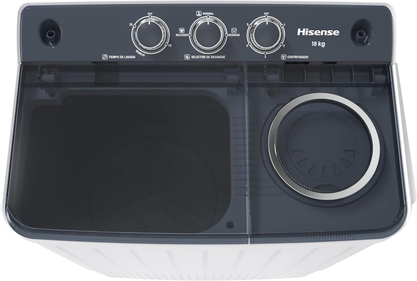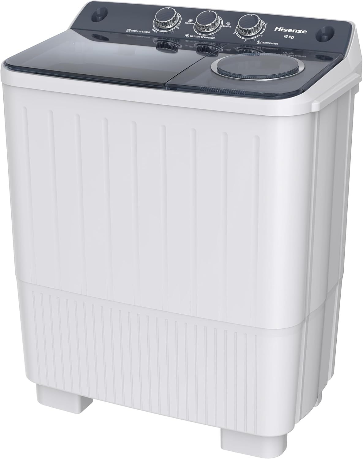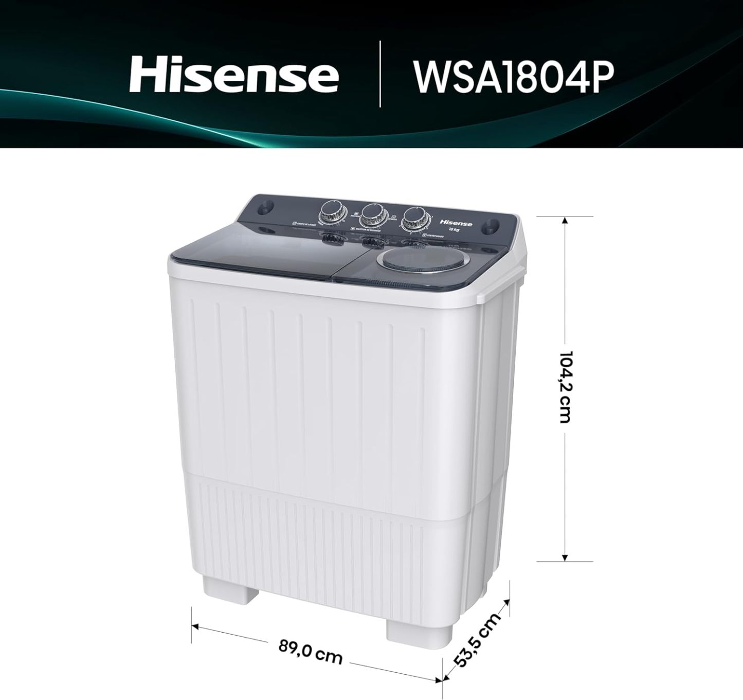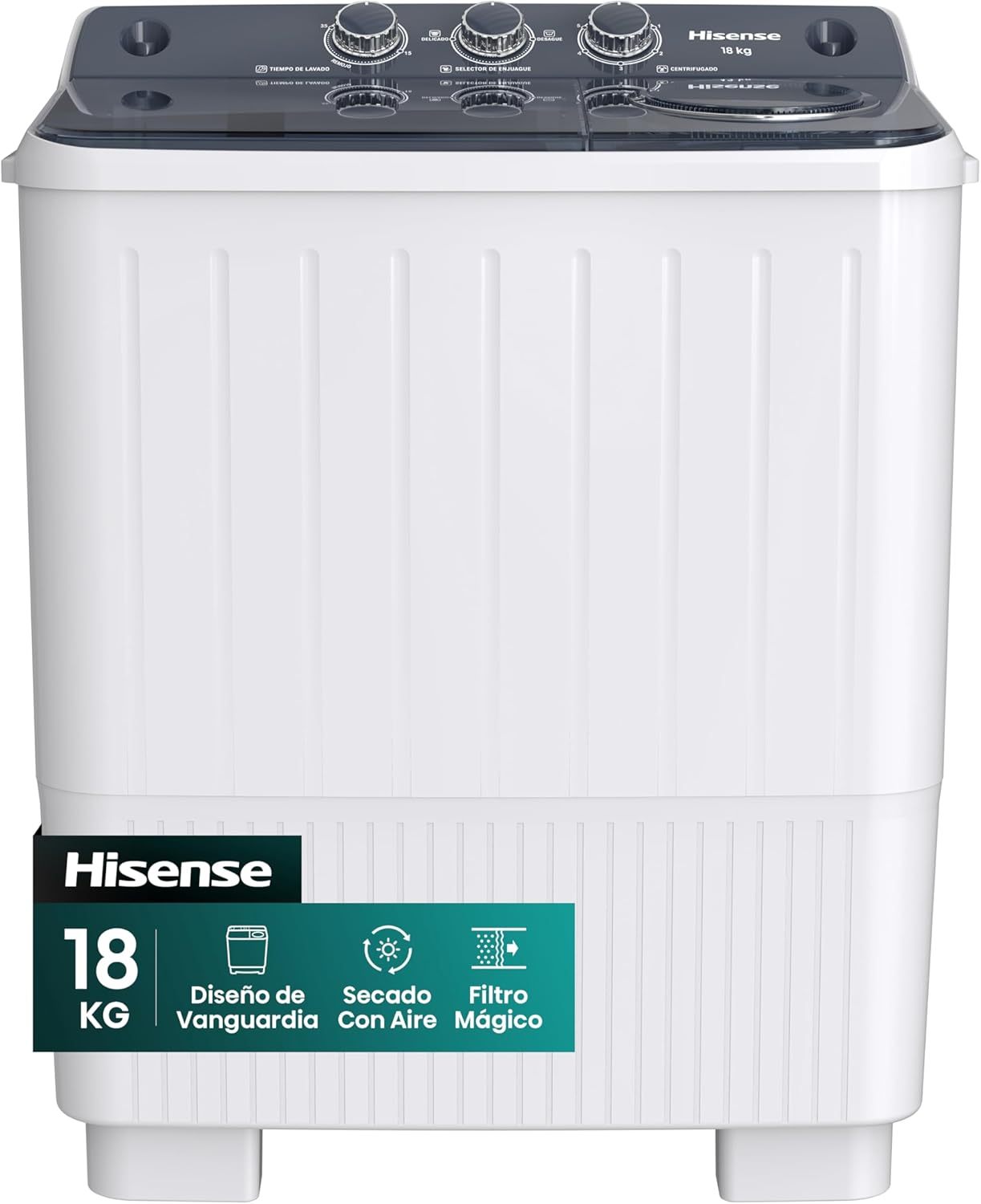 Hisense Lavadora doble tina WSA1804P, Semiautomática, 18 Kg, Temporizador de Lavado y Centrifugado, 89x54x104cm(AnchoxLargoxAlto), Blanco/Gris